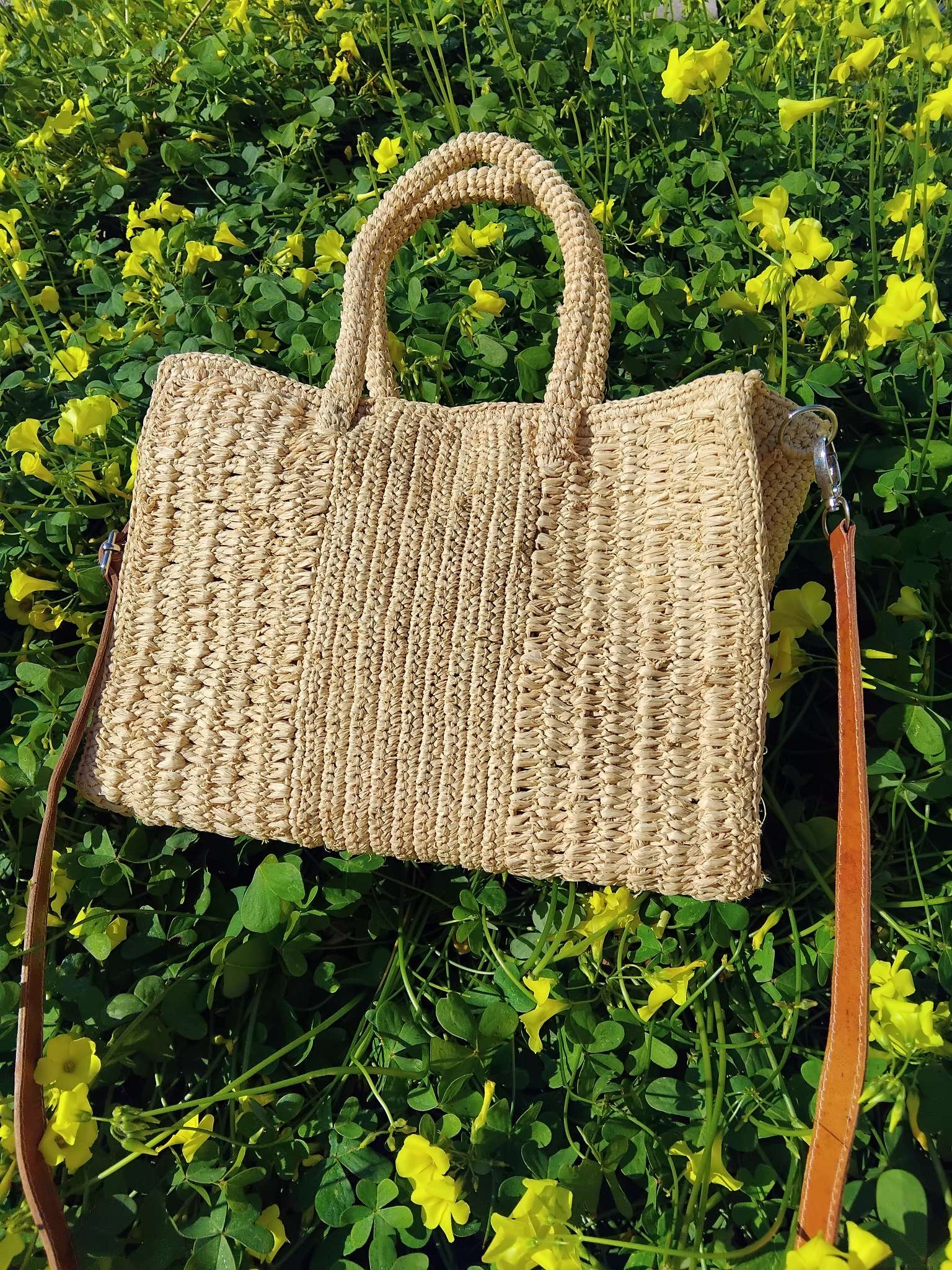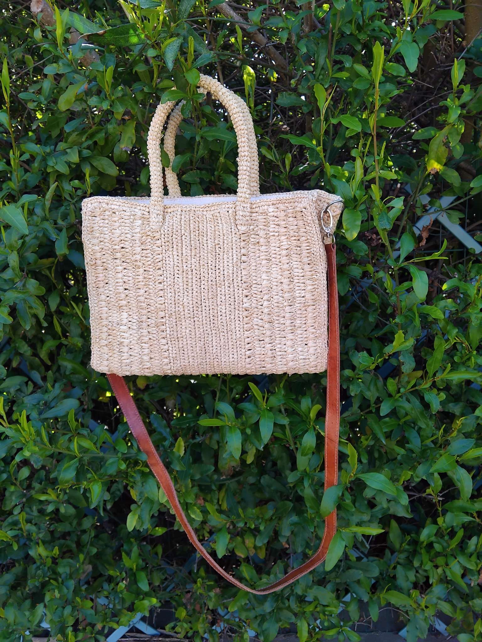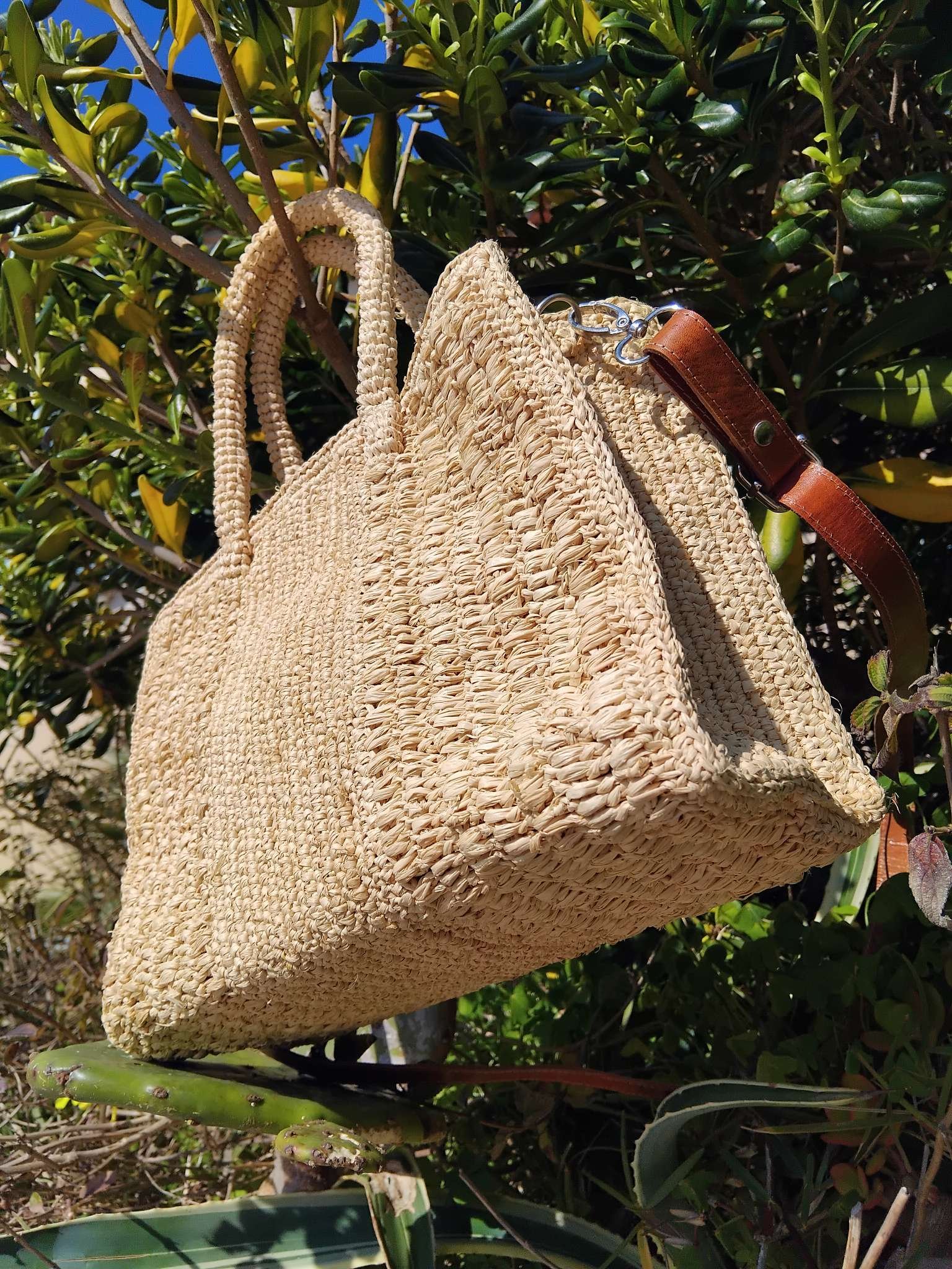 Petit sac à bandoulière en raphia naturel confectionné à la main au crochet.