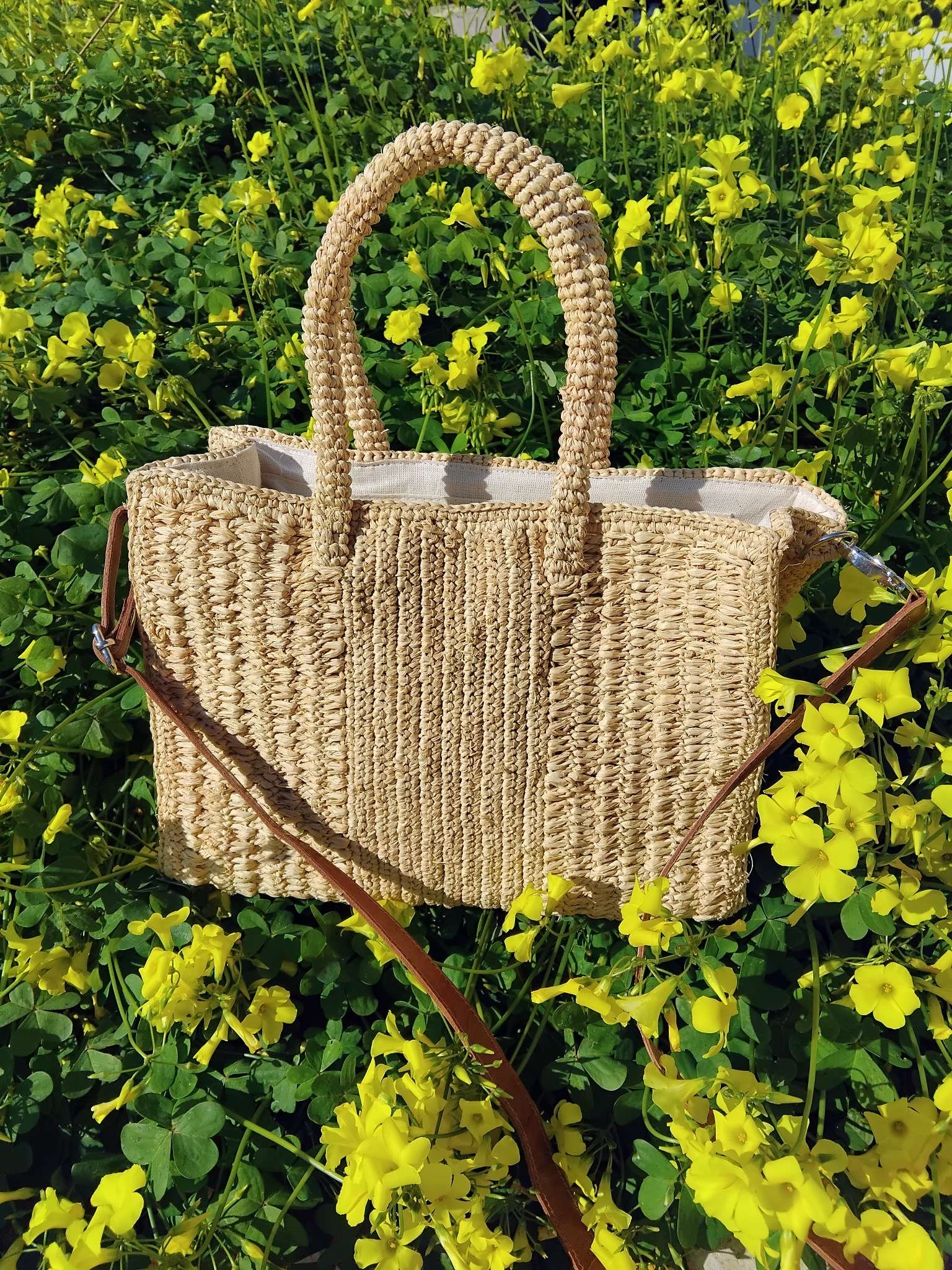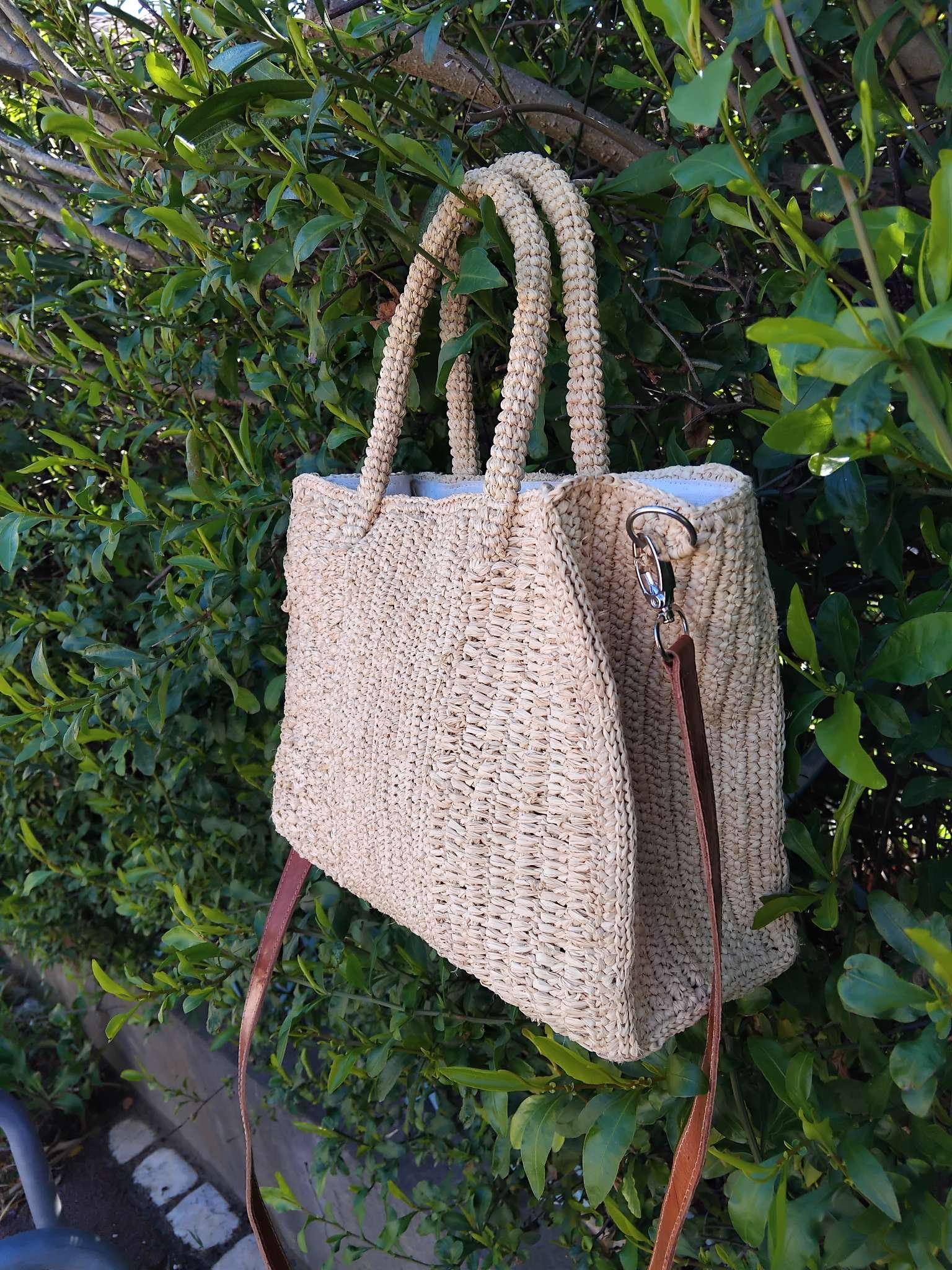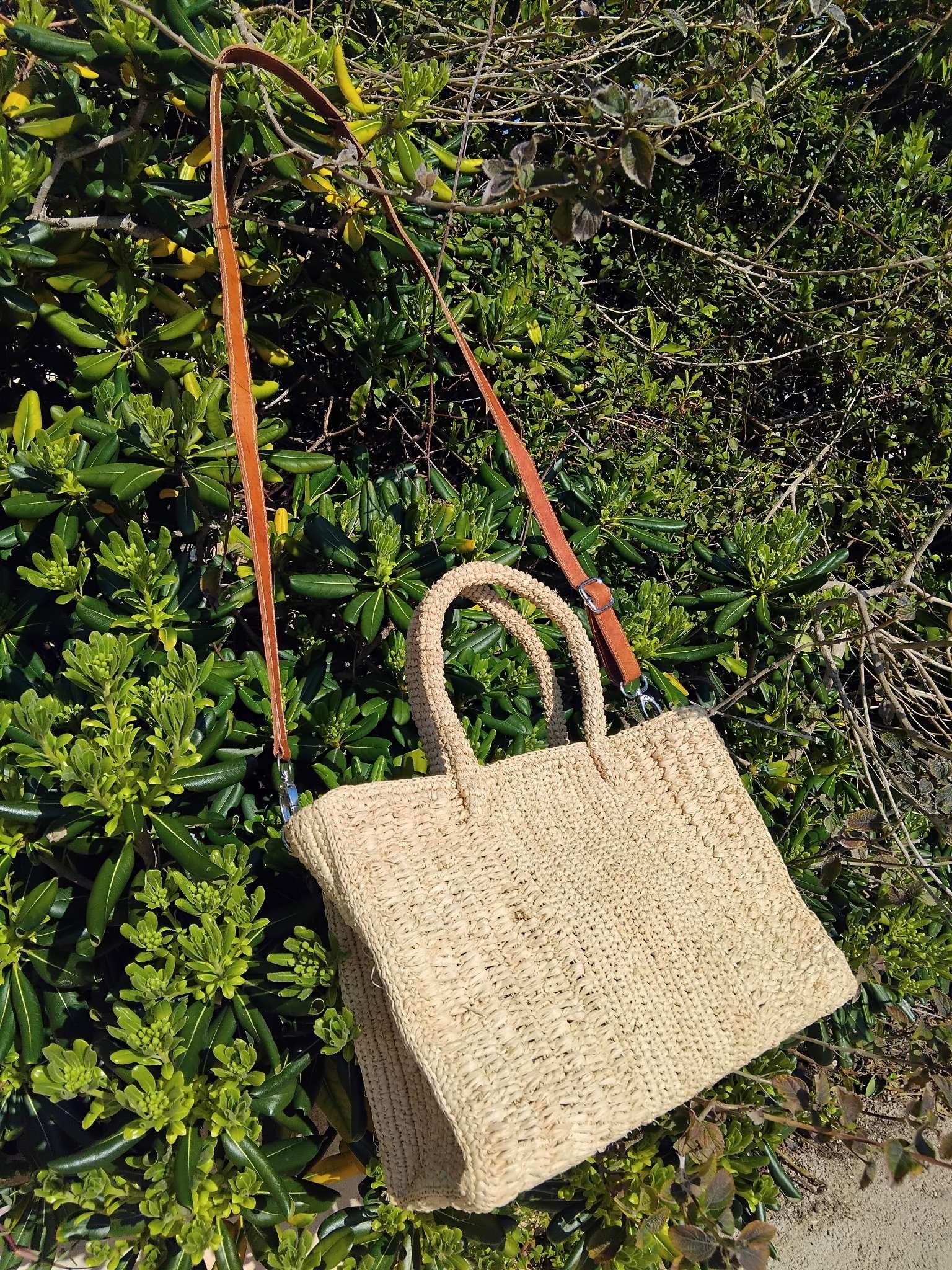 Petit sac à bandoulière en raphia naturel confectionné à la main au crochet.
